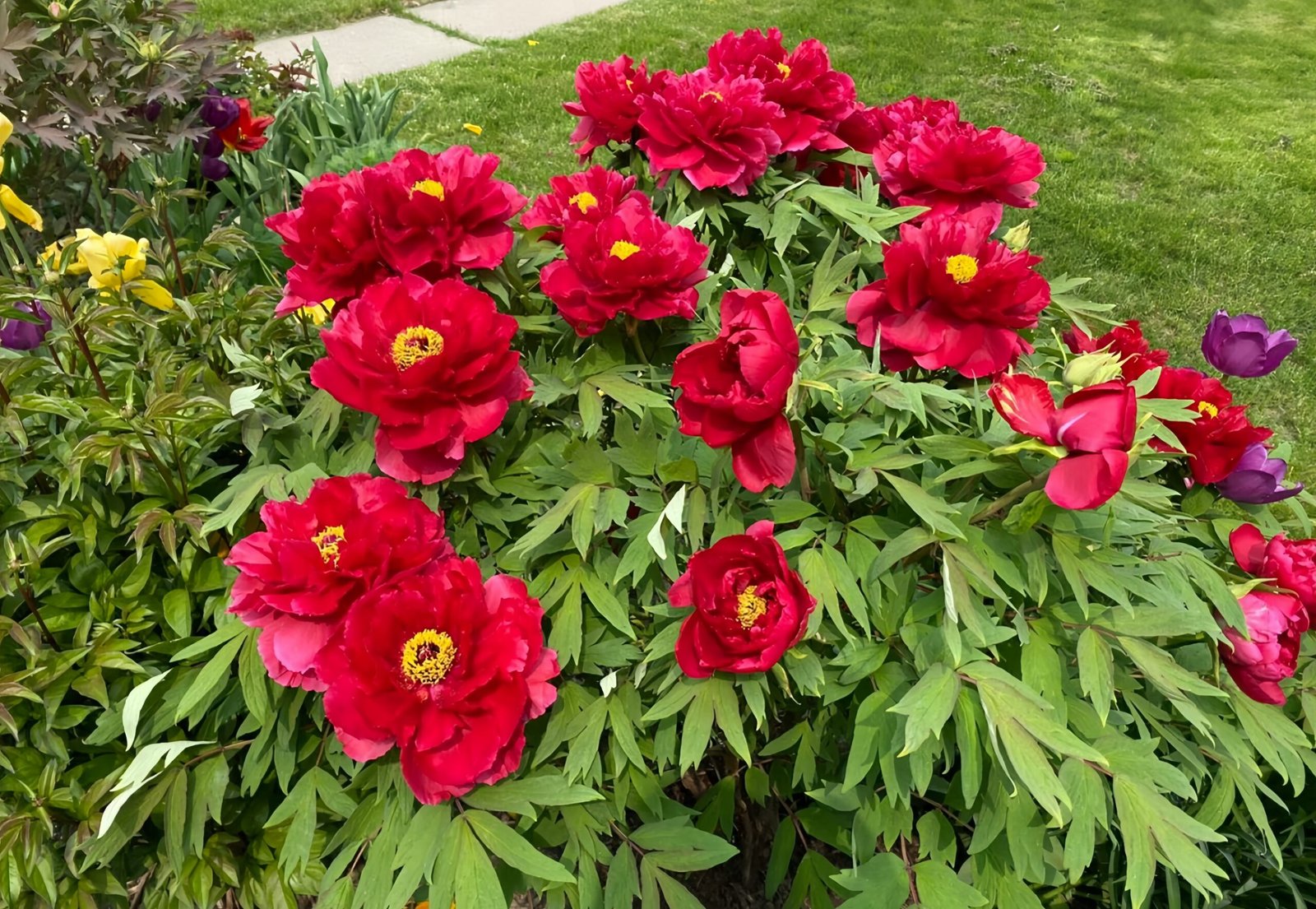 Fangji Peony (ぼたんほうき,Botan Hōki), also called “Beautiful Prime Peony”, is a Japanese-bred red peony. Bred in 1933, it has extremely saturated, rich red-purple blooms—among the deepest in red peonies.